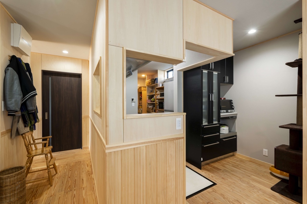 奥の扉の中は家事室になっており、廊下からもキッチンからも行ける便利な動線になっています。