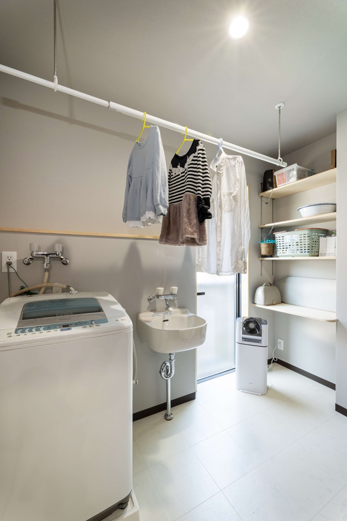 スロップシンクやアイロンがけの棚も設置し、洗濯に必要な道具は全てここに収納できるようになっています。