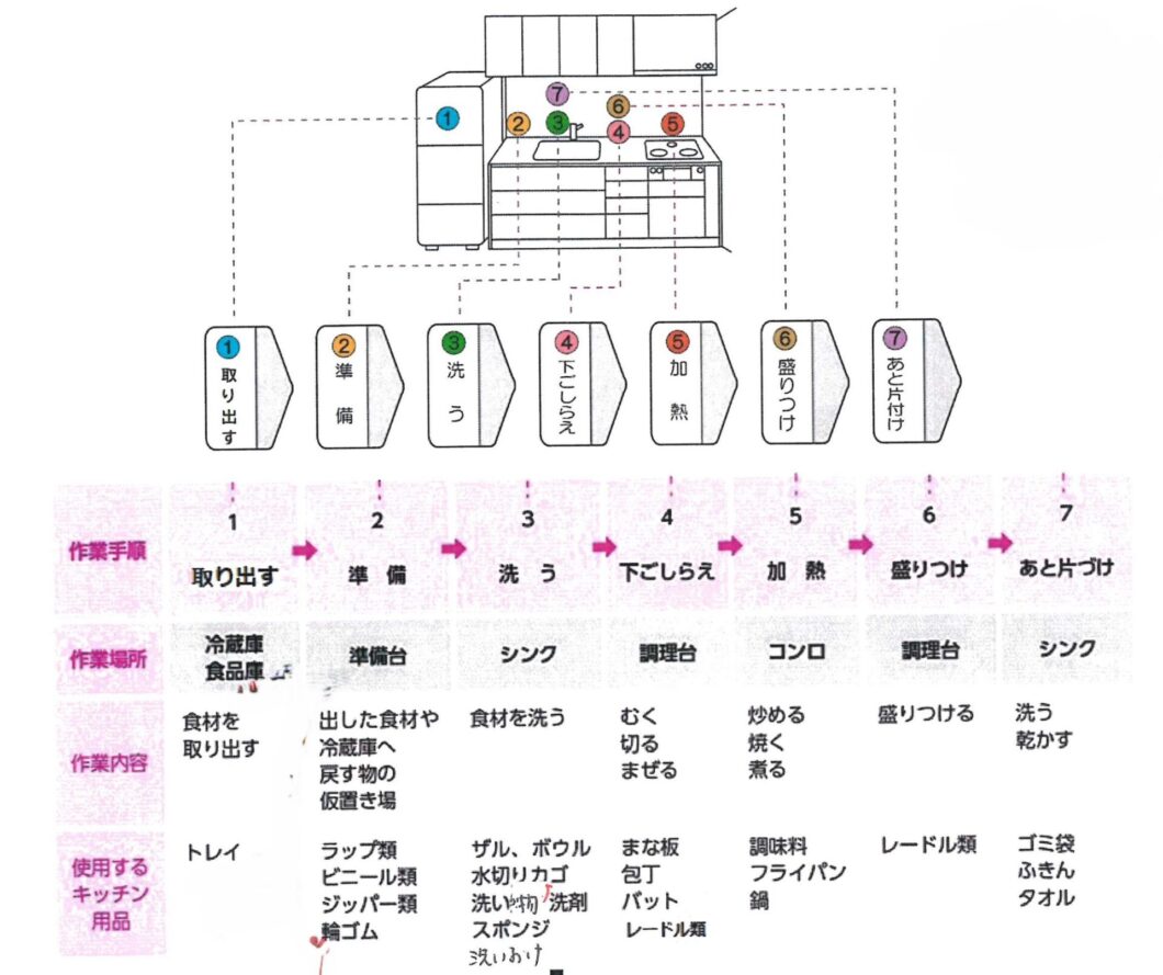 収納場所を決める際には、調理の作業手順を考慮することが重要です。たとえば、調味料は調理台やコンロ付近、カトラリーは配膳しやすい場所に収納するなど、手順に沿って使うものを使用場所の近くに配置すれば、自然と片付けもしやすくなります。(参考資料:『住まい方ハンドブック2』住まい方アドバイザー近藤典子、東京書籍)