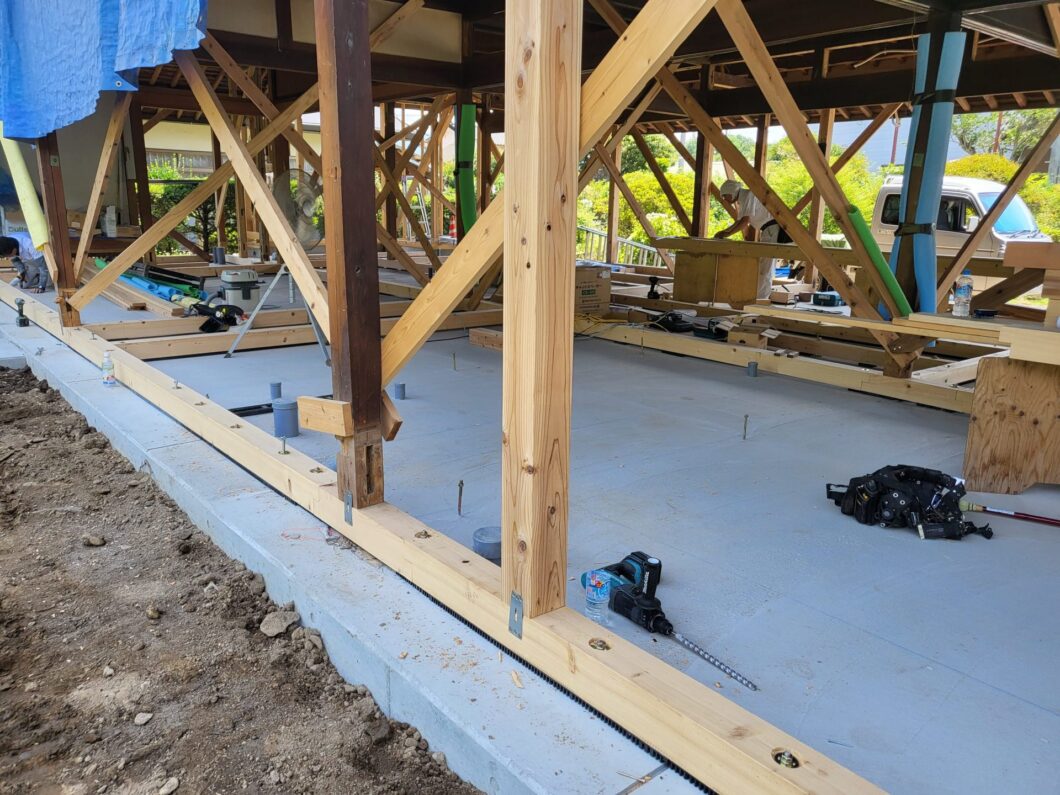 築100年以上ということで、基礎構造からやり直す必要がありました。ベタ基礎にした上に土台を引き直し、既存の柱を乗せ直します。