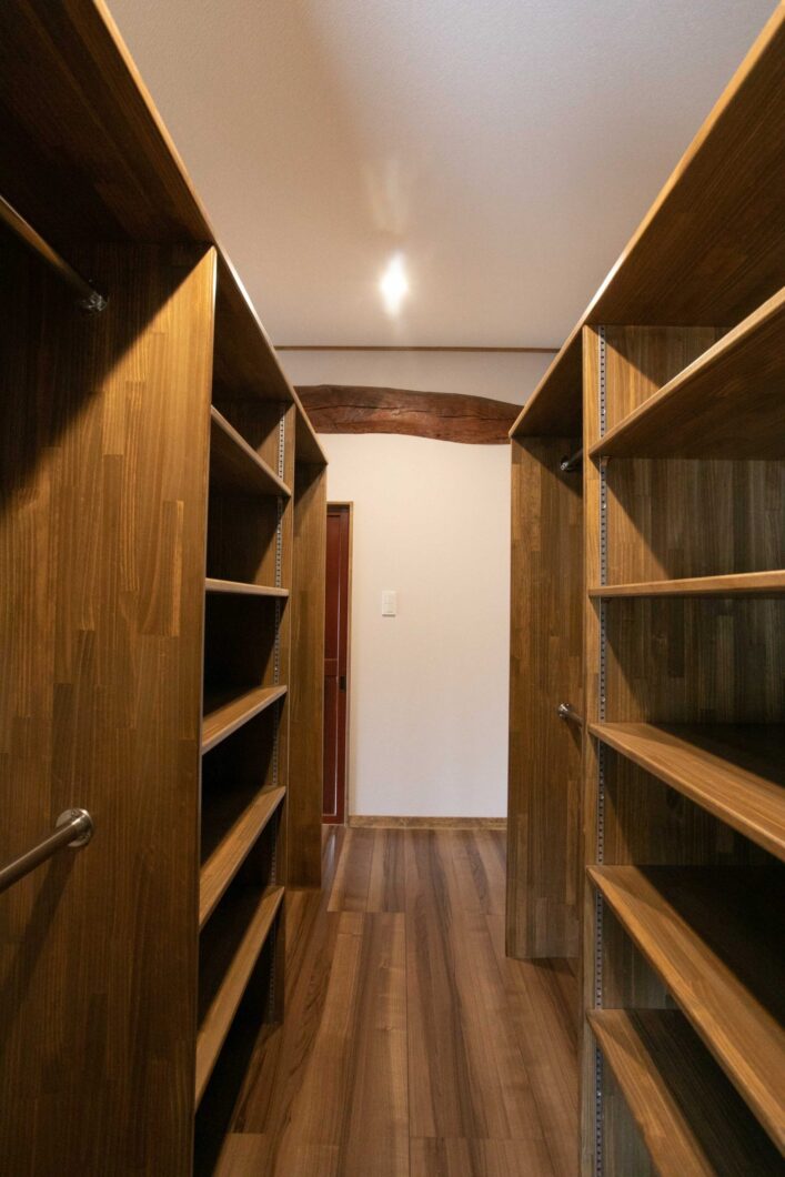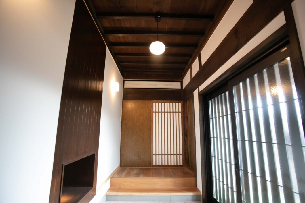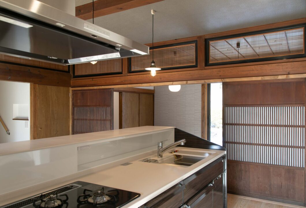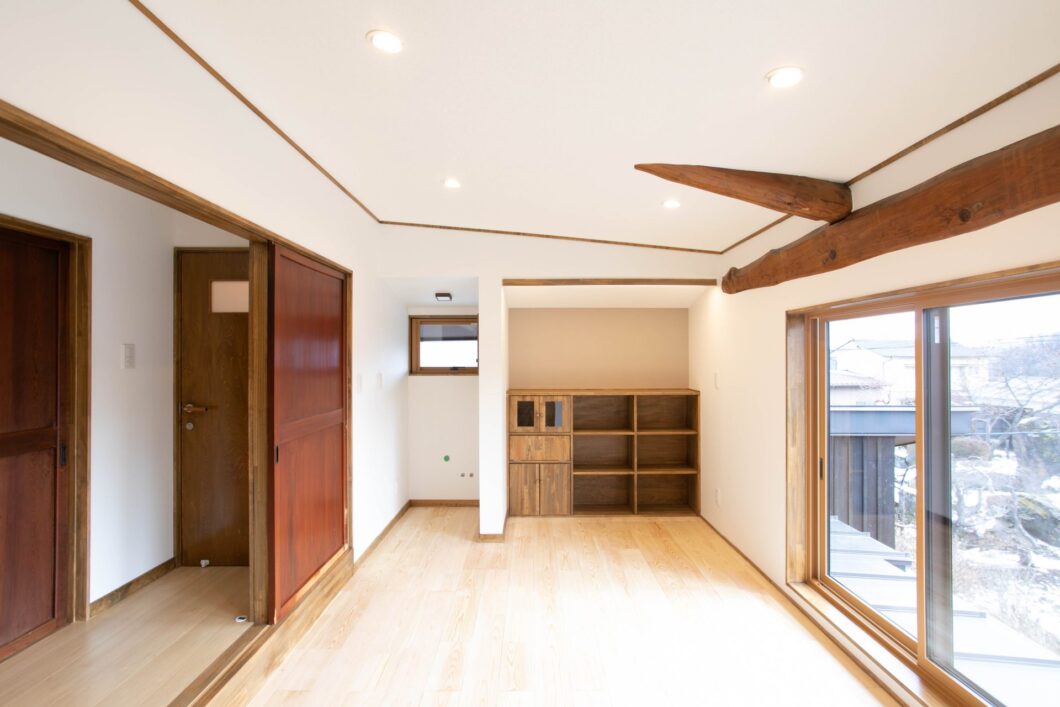 親世帯と子世帯は玄関を挟んで左右対称のような間取りとなっており、子世帯は明るい雰囲気に、親世帯は古民家の雰囲気を活かした落ち着いた空間となりました。