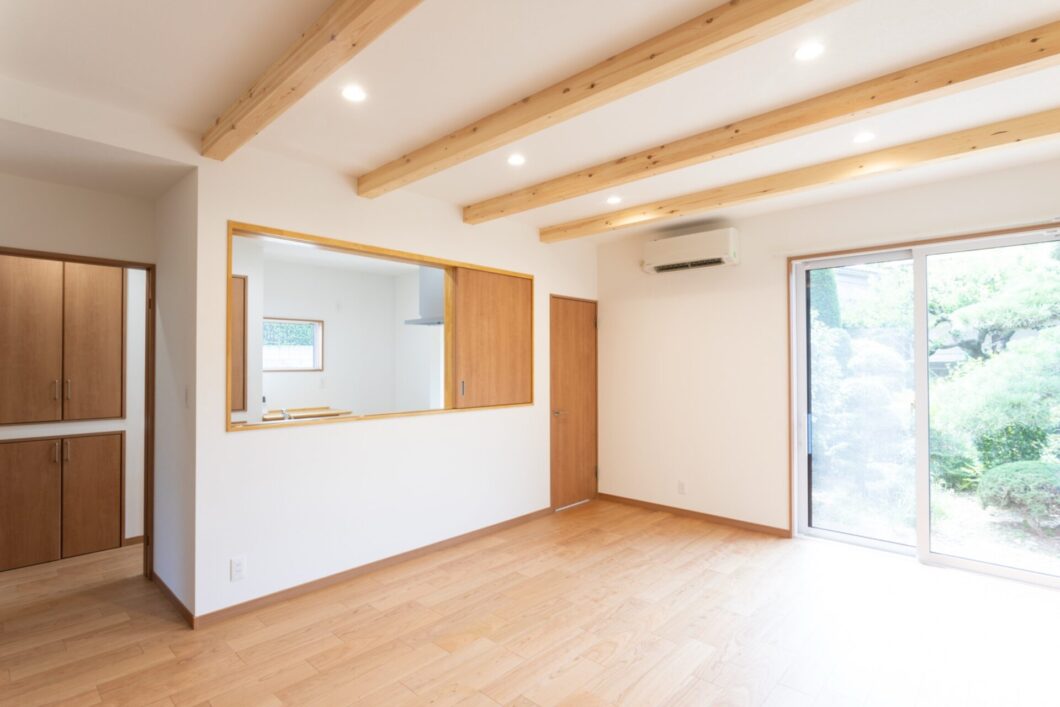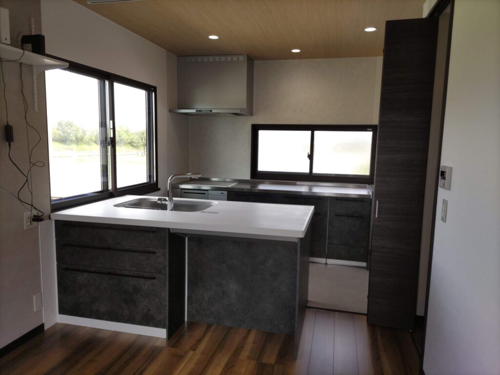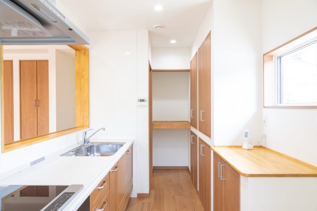 キッチンは、普段は扉を開けてリビング全体を見渡せる開放的なつくりですが、来客時には扉を閉めて手元を隠せる工夫も。生活感を上手にコントロールできる間取りは、訪れる方への心遣いにもつながります。