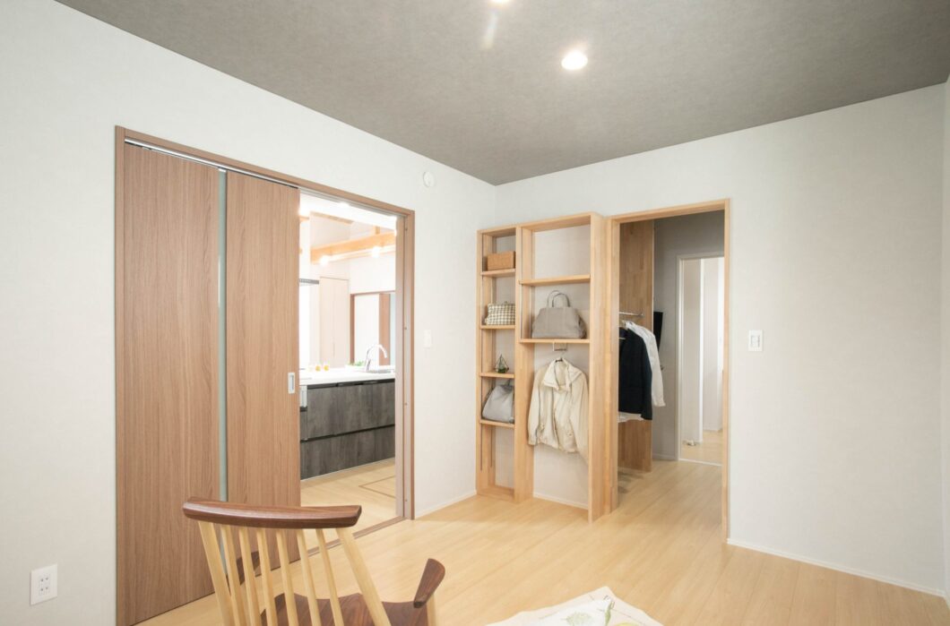 ひときわ目を引く大屋根のおうち。お子様が巣立った後のご夫婦での生活も見据え、1階に水廻り・クローゼットや寝室を配置し、ワンフロアで暮らしができるようにしました。寝室からは、WICを通りランドリールームを兼ねた洗面室・脱衣所へと家事動線の良い間取りとなっています。アイランドキッチンからのアクセスも良く、キッチン→寝室→WIC→ユーティリティ→脱衣室・UBへと、ラウンド動線&の8の字動線で家事効率アップにつながります。