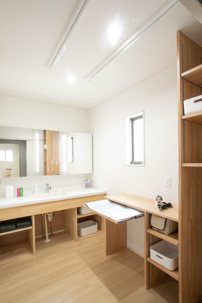 朝の忙しい時間の強い味方になるのが、横幅のある洗面台。3人並んでも余裕のある幅を確保しました。洗面台のある空間はユーティリティとしての機能も兼ね備えています。夜洗濯をする奥様のために室内物干しも設置。アイロンがけをするご主人のためにアイロン台もあります。ご家族のご要望で脱衣室は別に。家族が入浴中でも気兼ねなく洗面台を使えます。