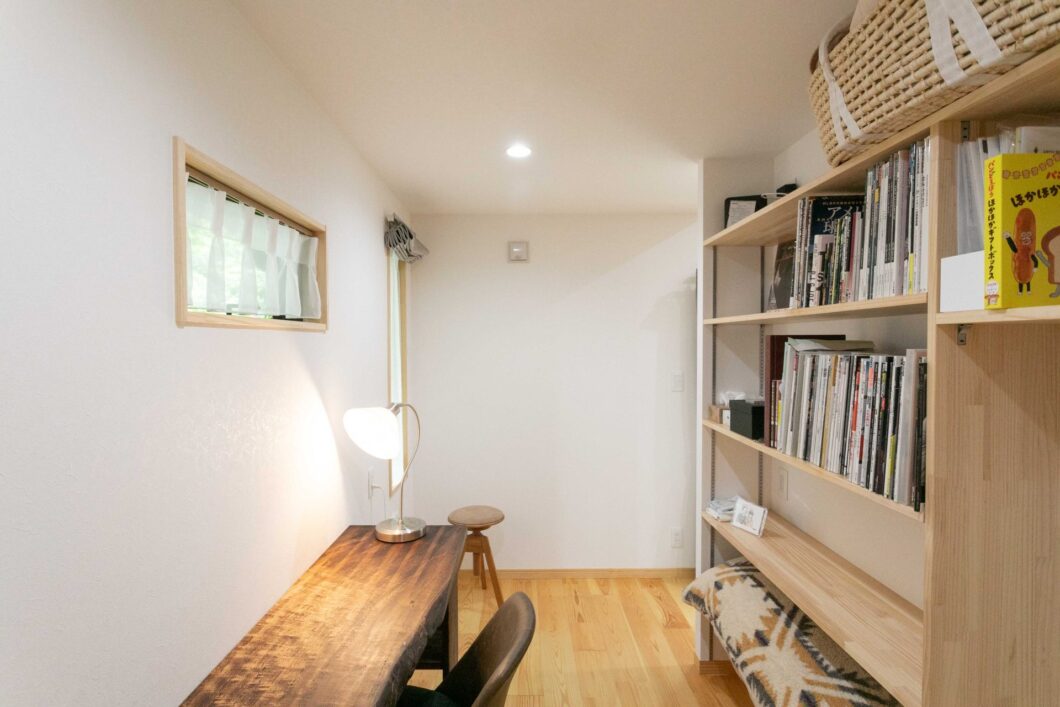 大きな間取り変更はなかったのですが、室内側の下地は解体し天井・壁には新たに断熱材を充填しています。合わせて工事範囲の外窓はすべて交換しています。LDKの床は、お子様も考慮し県産材のあずみの松を使用。既存の和室の壁を聚楽の上にチャフウォールで重ね塗りにしています。