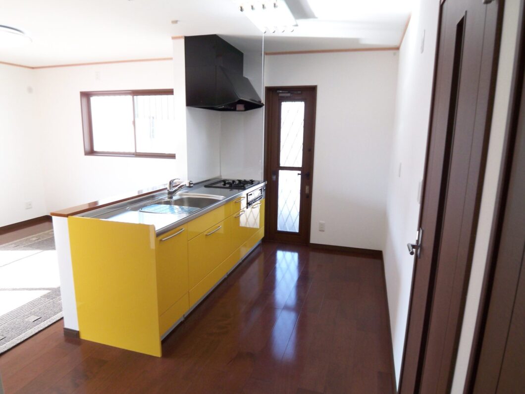 フローリングや建具の色をダーク系の落ち着いた感じにすることで、奥様がこだわったキッチンカラーがひときわきれいです。