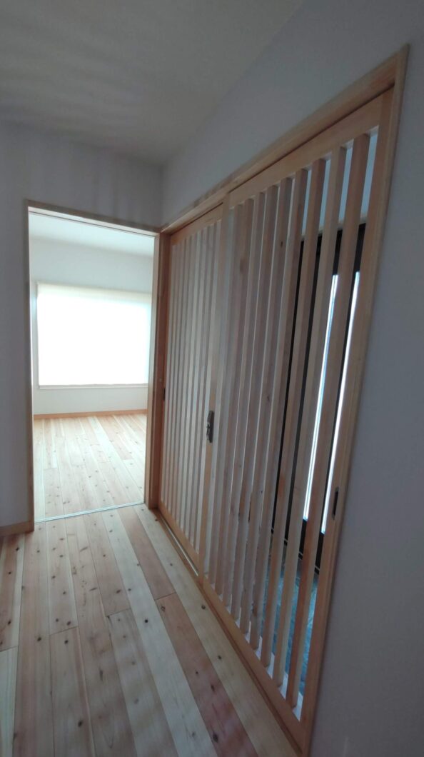 床には無垢のあずみの松、壁はホタテ貝由来のチャフウォールを使用しています。既存の開口部に合わせ既製の内装建具ではなく、各々の開口に合わせた造作建具で仕上げました。
