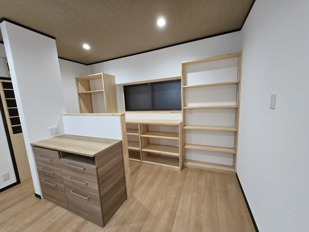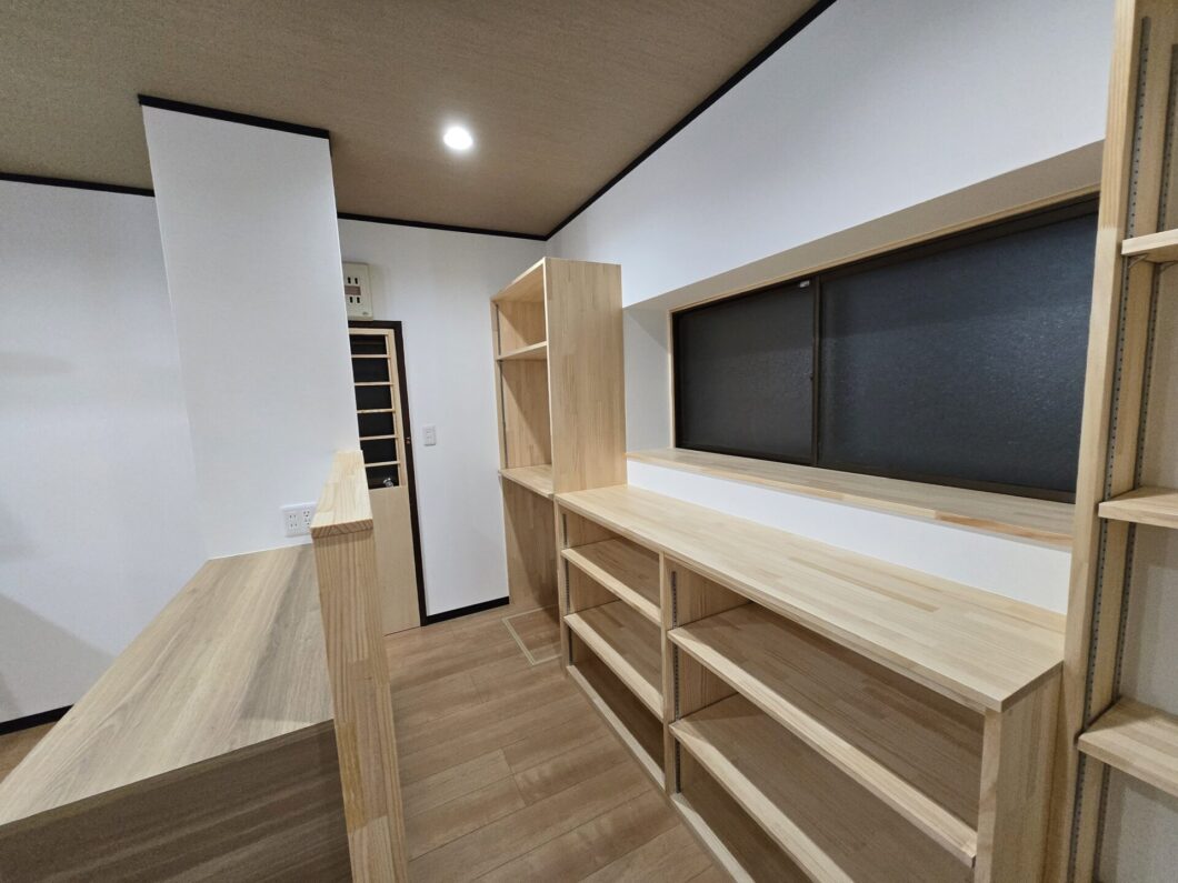 キッチンを北側から部屋の中央部分に持ってきて、対面キッチンをすることでリビングも見渡せて家族との会話もできるようになりました。カウンターを設けることにより、個々になりがちな朝食時に利用したり、お子様の勉強スペース、ご夫婦の憩いの場所としてもお使いにいただけます。キッチン背面にはカップボードを中心に回遊動線になるようにし、その裏側に造作棚でパントリーを配置しました。共働きで買いだめもするということでしたので、食品のみでなく日用品のストックもしていただけます。リビングからは奥まった場所なので、ちょっと散らかっても気になりにくいです。