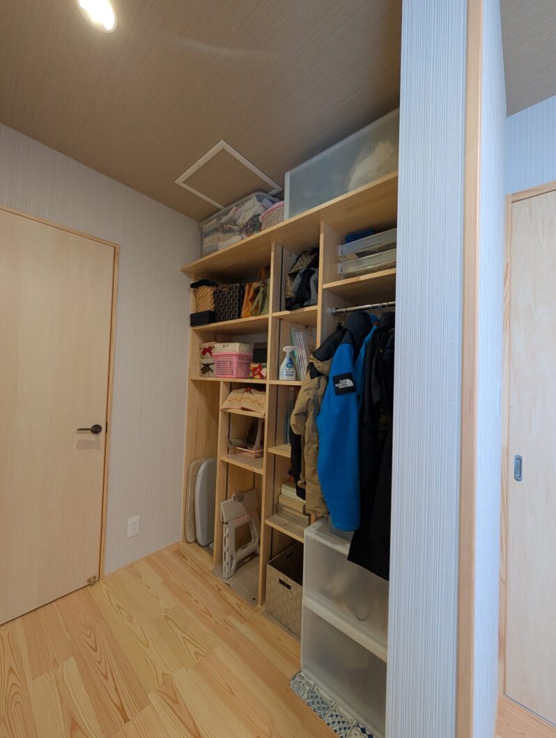 寝室にする和室は、そのまま床をフローリングにしてベッドを配置すれば寝室にはなりますが、寝室の要素として”身支度をする”という要素があります。それをどう組み込むのかが課題となりました。M様はお持ちのタンスをそのまま持ち込もうかとお考えでしたが、タンスがならんだ空間は地震のことを考えると安心とは言えません。壁で仕切りクローゼットとして使うというご提案をいたしました。”たたんでしまう”という動作うより、”かけてしまう”という動作の方がワンクッション少なくなります。はじめM様は想像できないからと躊躇されましたが、具体例をお見せしながらご説明をしたところ、提案を受け入れていただけました。