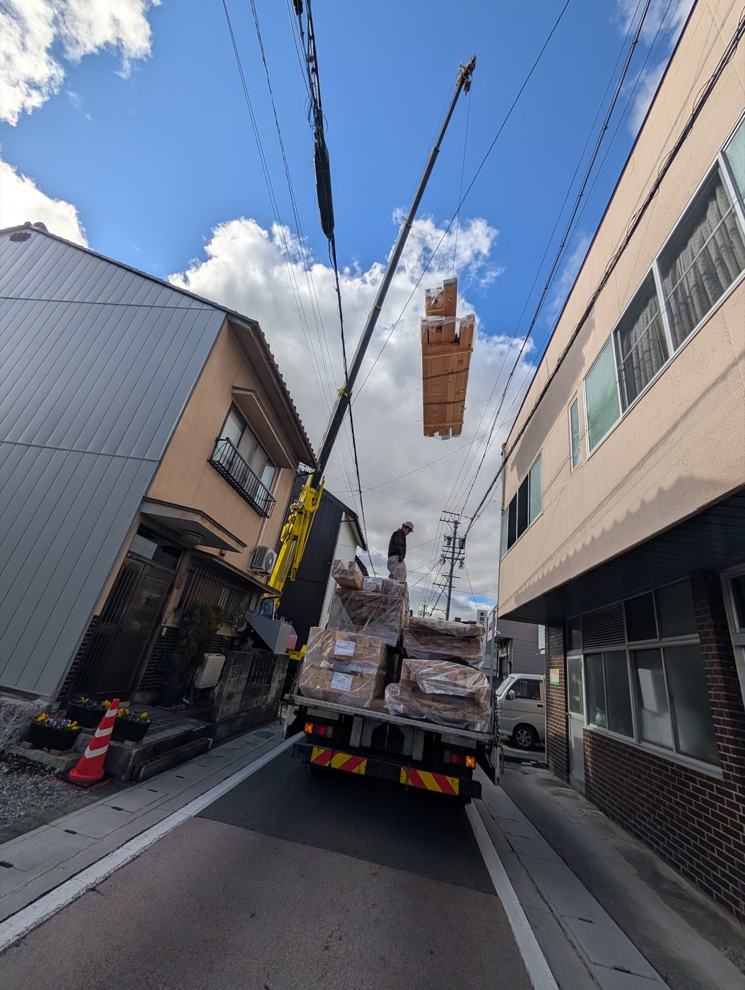 通常であれば、建前の前日に敷地内に資材を搬入しておくのですが、今回はそれが叶わず一時的に道路を封鎖し、時間を区切っての資材搬入を実施。クレーンや大型トラックの位置取り、通行の妨げにならないようなタイミングの調整など、細やかな段取りが求められました。